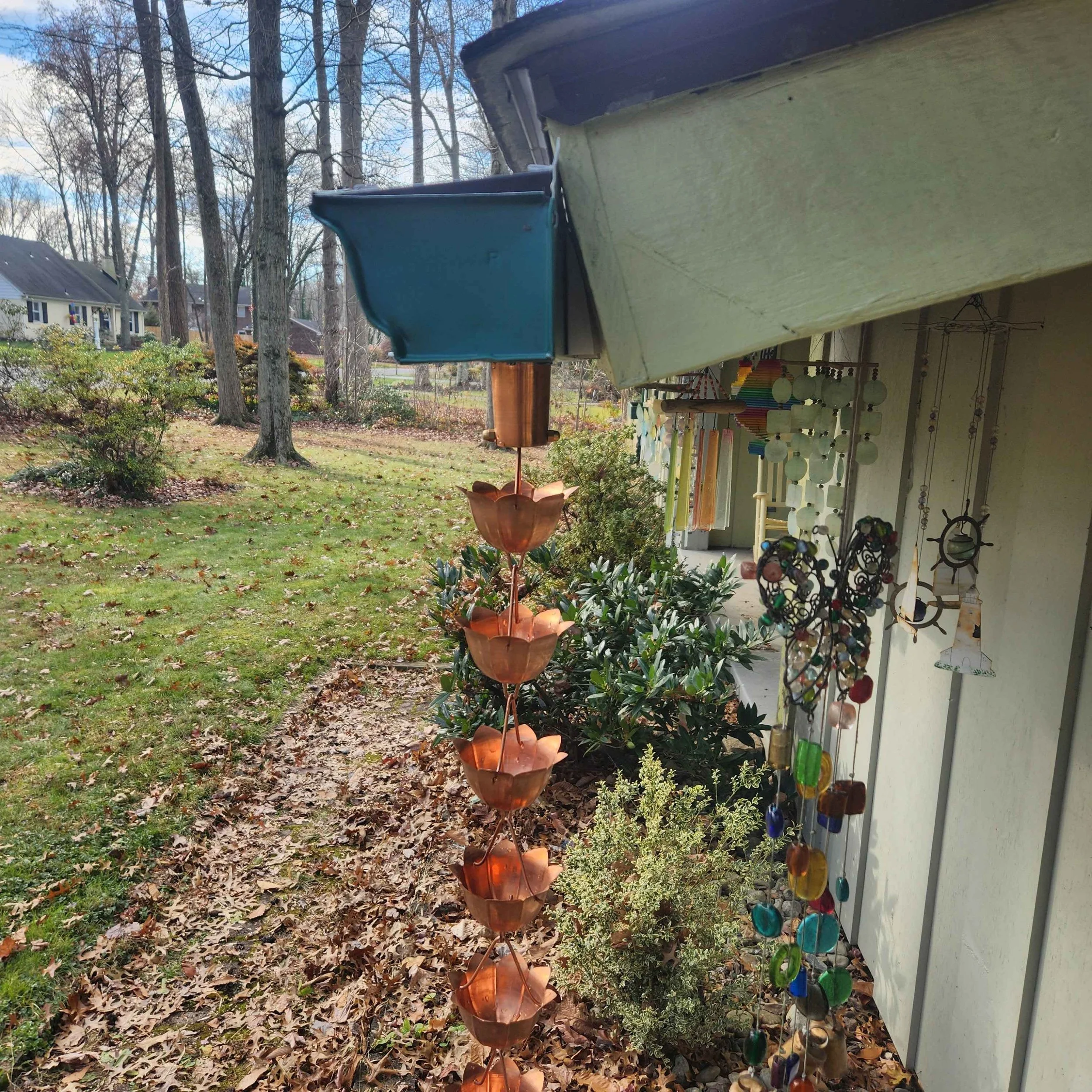 Clean lines, correct pitch, and decorative copper rain chains — a custom install for a tricky fascia.