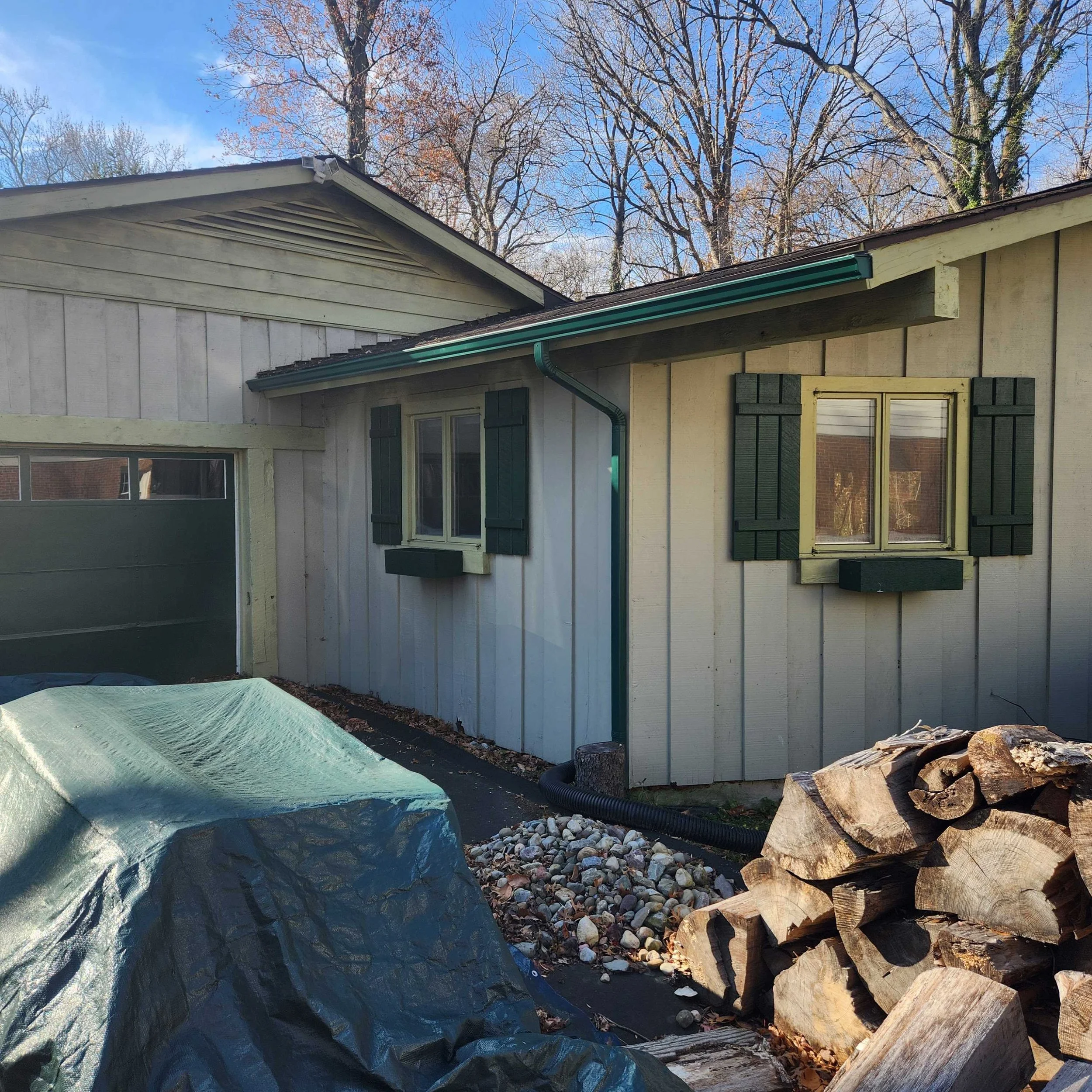 This home never had gutters, and the slanted fascia made installation far from straightforward. We installed Grecian Green seamless gutters and used more than 100 gutter wedges to level each run for proper flow. When the structure is off-angle, precision matters — these gutters are now aligned, secure, and ready to move water away from the home for the first time.